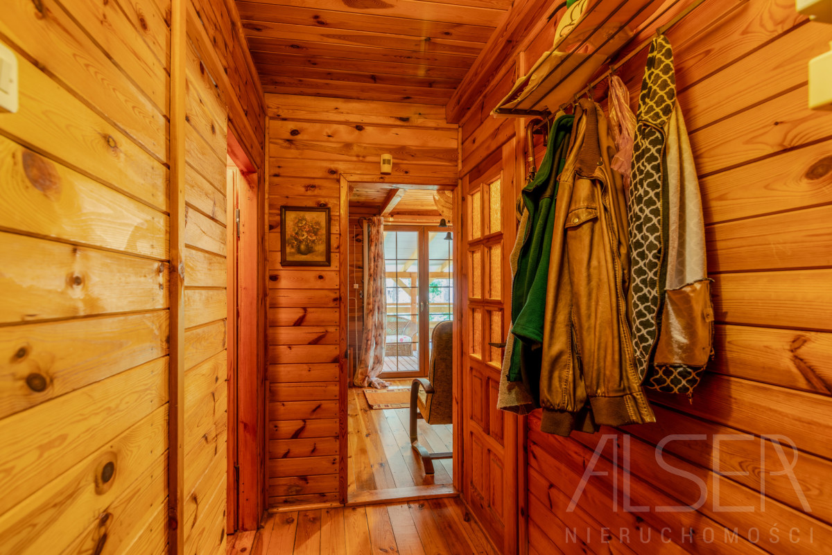 Do budynku wchodzimy przez ganek, gdzie znajdziemy miejsce na odzież wierzchnią. Korytarz łączy wszystkie pomieszczenia z którego to przejdziemy do jednej z sypialni, łazienki z kabiną prysznicową oraz salonu. Z salonu jest wyjście na zadaszony taras, do sypialni oraz kuchni z częścią jadalnianą. Dom sprzedawany z całym wyposażeniem. W 2024 roku został wybudowany komin pod zamontowanie kominka lub kozy.