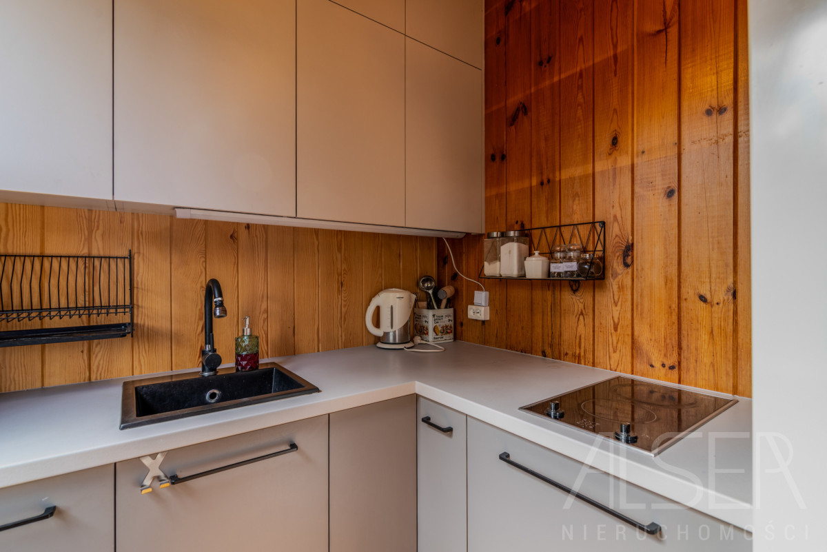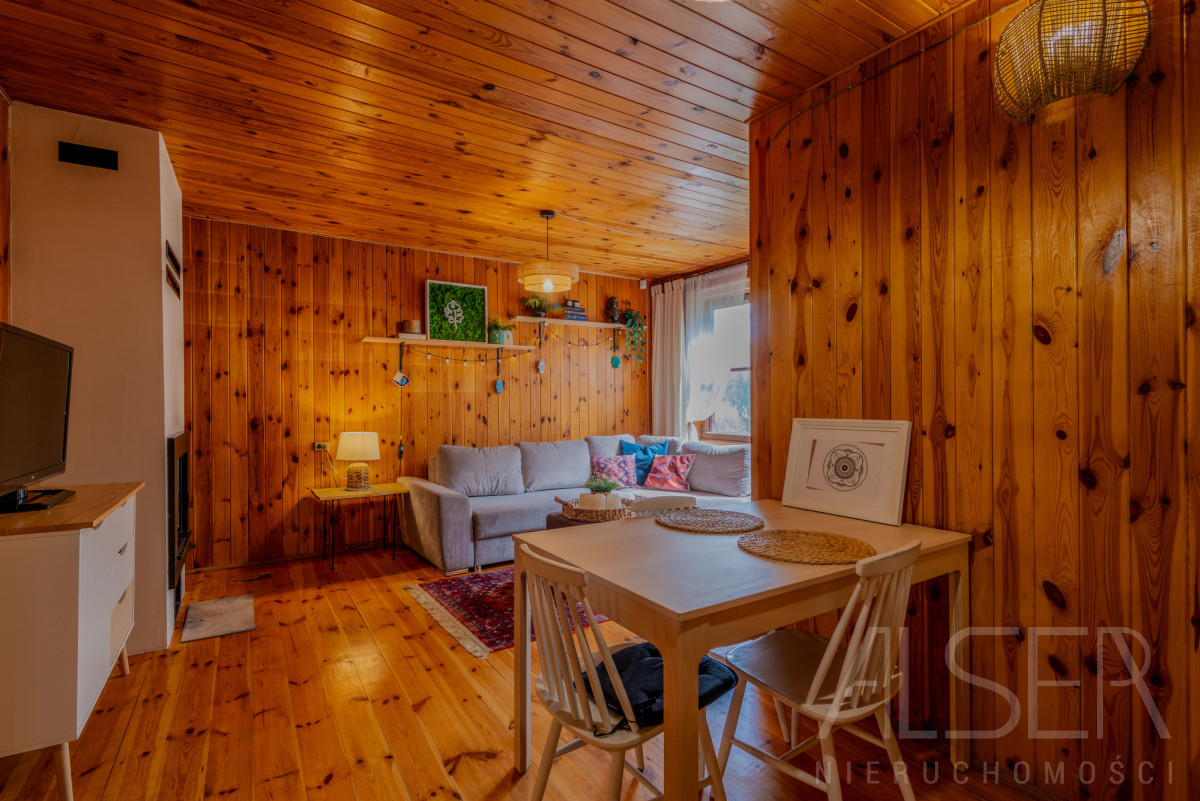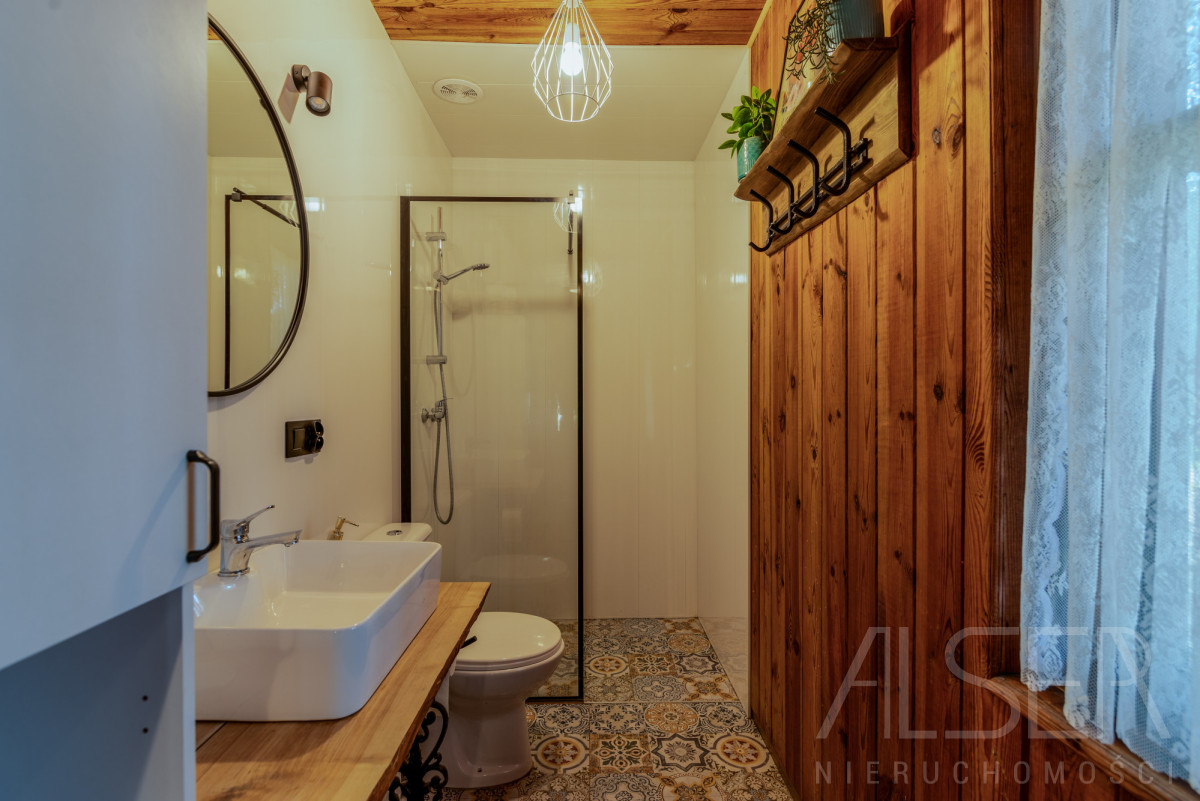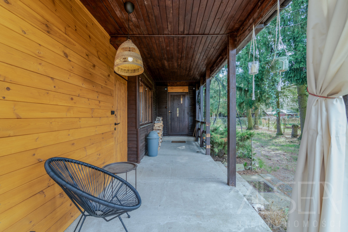 Do budynku wchodzimy przez duży zadaszony taras. Z wiatrołapu, w którym znajdziemy miejsce na odzież wierzchnią oraz parę drzwi gdzie jedne z nich prowadzą do widnej łazienki z kabiną prysznicową(został w niej przeprowadzony remont w 2022 r.), a drugie do serca tego domu czyli dobrze doświetlonego salonu z kominkiem. Kuchnia jest ergonomiczna i maksymalnie wykorzystana w obecną zabudowę oraz sprzęt RTV/AGD.(remont w 2021 r.).