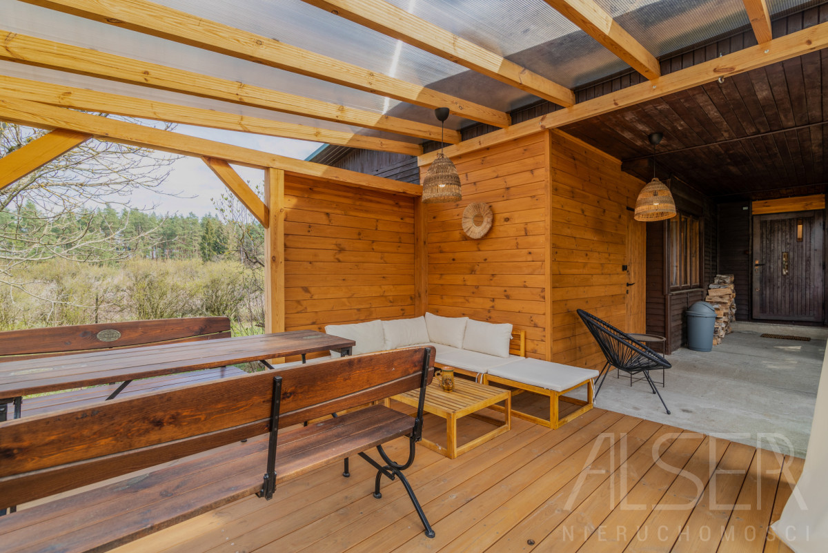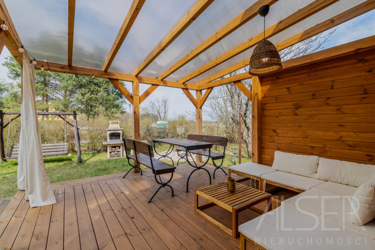 Na zewnątrz nowo wybudowany taras (2023 r.) pozwala nam na relaks i wypoczynek. W budynku znajdziemy również pomieszczenie gospodarcze, które to świetnie się sprawdza na składowanie różnych mebli ogrodowych, narzędzi etc.