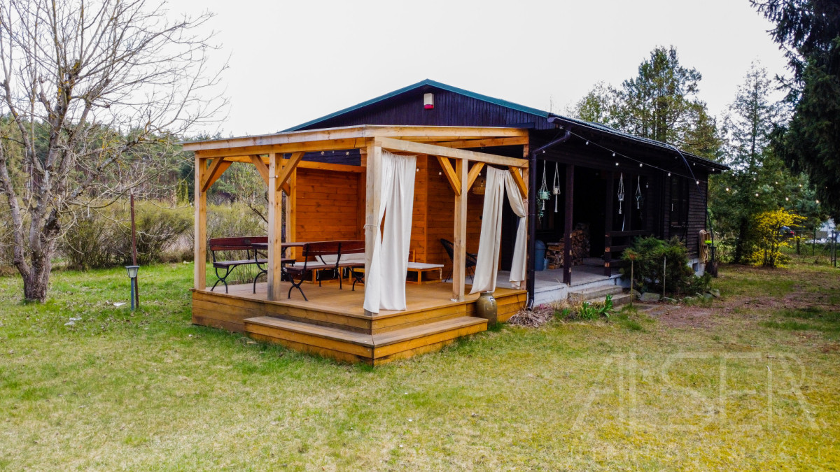 Dom parterowy o powierzchni 64 m2 z dużym zadaszonym tarasem w stylu Boho na działce 828 m2.