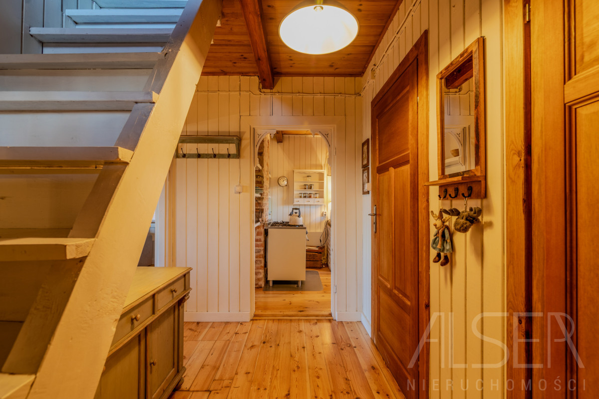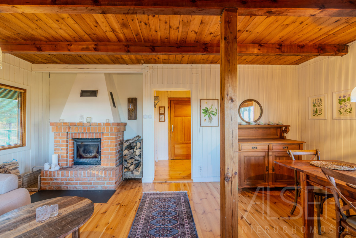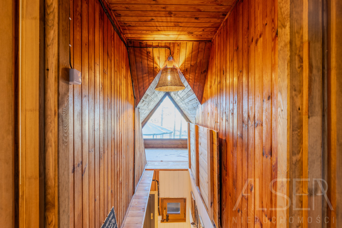Do budynku wchodzimy przez zadaszony taras. Z przedsionka, w którym znajdziemy miejsce na odzież wierzchnią, schodami wejdziemy na piętro. Na parterze w jego centralnej części znajduje się duży, dobrze doświetlony salon z kominkiem z cegły ceramicznej, w salonie dominuje ekspozycja wschodnia. Oddzielna widna kuchnia zabudowana szafkami z kuchenką gazową (gaz z butli). Na parterze znajdziemy również pomieszczenie gospodarcze, które to można zaaranżować np. na garderobę oraz łazienkę z kabiną prysznicową. Przestronny korytarz łączy wszystkie pomieszczenia. We wszystkich pomieszczeniach jest drewniana wycyklinowana podłoga. Na piętrze znajdują się dwie niezależne ustawne sypialnie. Jedna z sypialni posiada duże przeszklone okna oraz wyjście na taras, gdzie widok rozpościera się na okoliczną polanę.