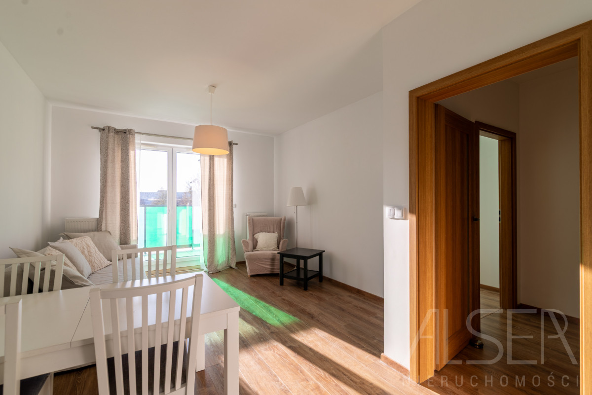 Lokal składa się z 2 oddzielnych pokoi z czego jeden jest połączony z aneksem kuchennym i wyjściem na duży balkon. Sypialnia jest ustawna oraz również posiada balkon francuski. Pokoje są niezależne, zamykane. Mieszkanie rozkładowe, gdzie całość uzupełnia przestronny korytarz. Po wejściu do lokalu po prawej stronie znajduje się duża zabudowana garderoba. Łazienka z WC oraz kabiną prysznicową z odpływem liniowym.