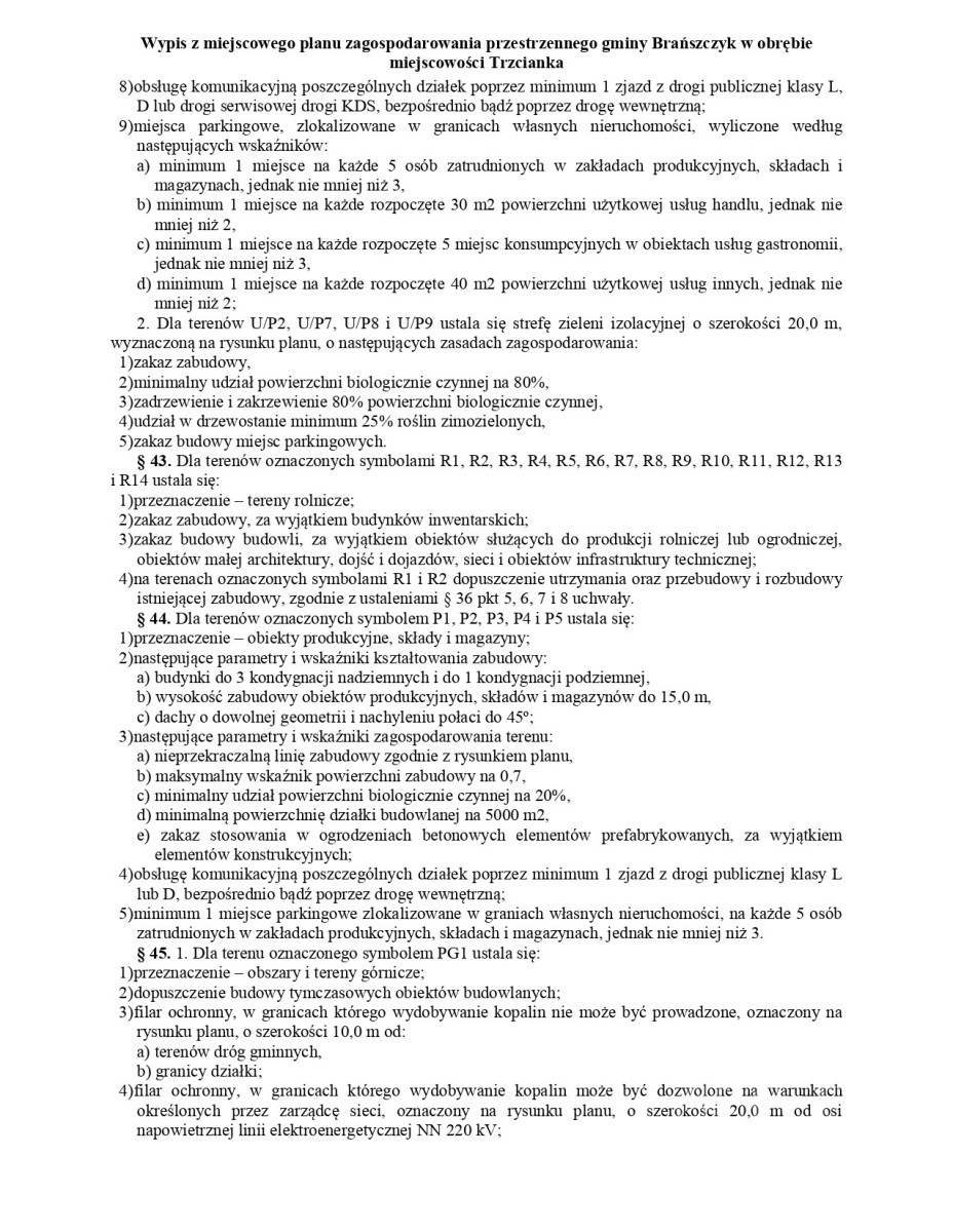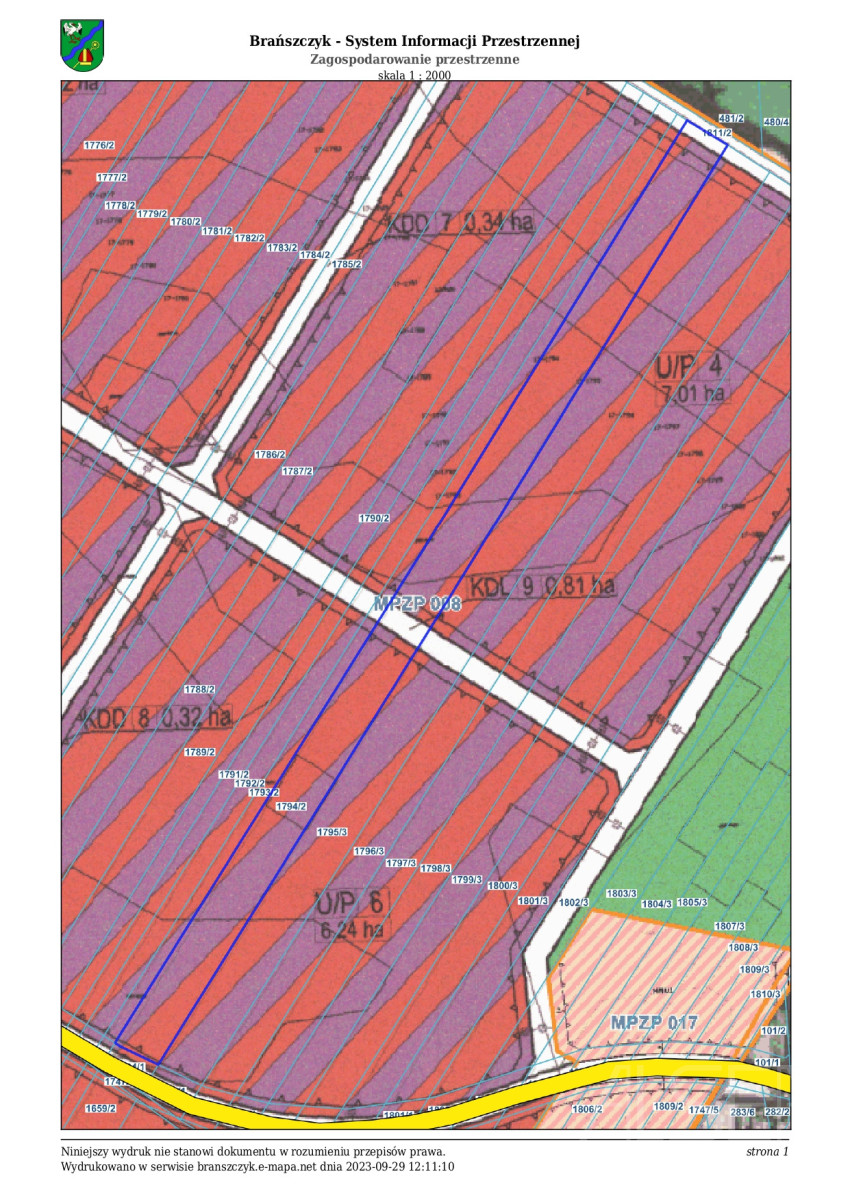 objęta Miejscowym Planem Zagospodarowania Przestrzennego oznaczona symbolem U/P 4 oraz U/P 6, gdzie głównym przeznaczeniem jest zabudowa usługowa i obiektów produkcyjnych, składów oraz magazynów. Działka o powierzchni ok. 25 metrów szerokości oraz ok. 536 metrów głębokości o łącznej powierzchni 12 646m2 oznaczona numerem 1794/2. Istnieje możliwość doprowadzenia mediów, które są oddalone o ok. 330m od działki. Do działki dojazd drogą gruntową utwardzoną. Jest możliwość dokupienia działki po sąsiedzku, wtedy szerokość działki wynosić będzie ok. 50m.